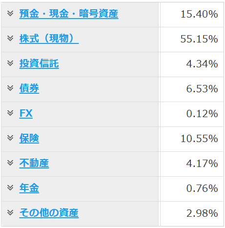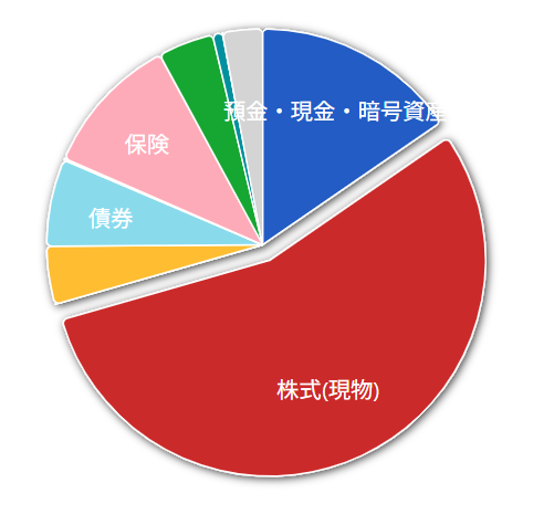 投資信託や年金(iDeco)もほぼ全て株式運用なので、60%くらいが株式運用になっています。